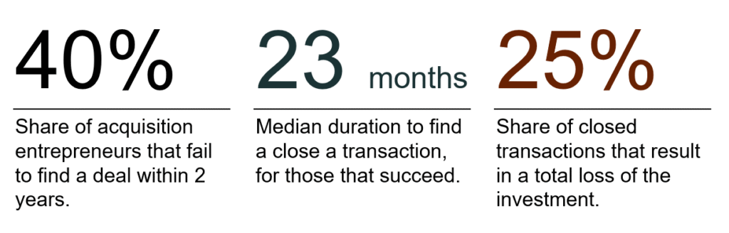 Despite a vast target set, many acquisition entrepreneurs fail to find a deal within 2 years, and 25% of deals that close result in a loss.